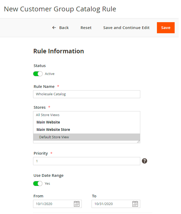 Stores — select store views to apply the rule to;