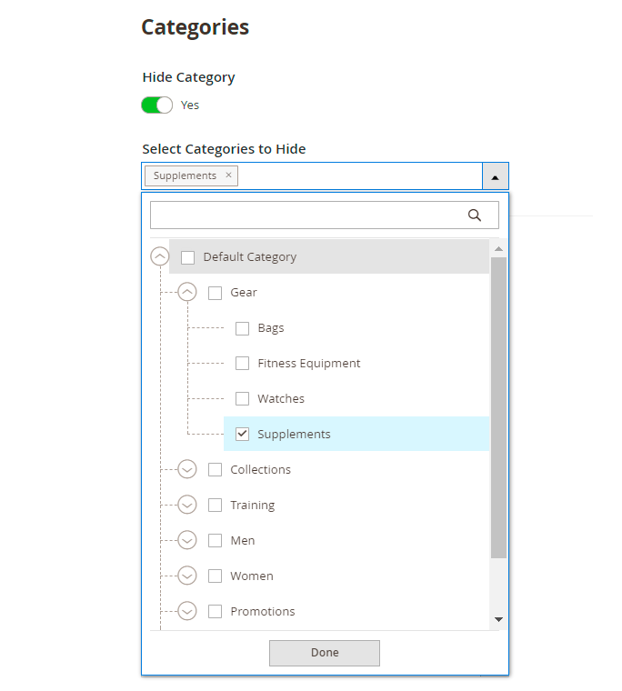 Hide Category - activate this option to hide categories you choose below. If you don't want to hide any, just turn off the toggle.