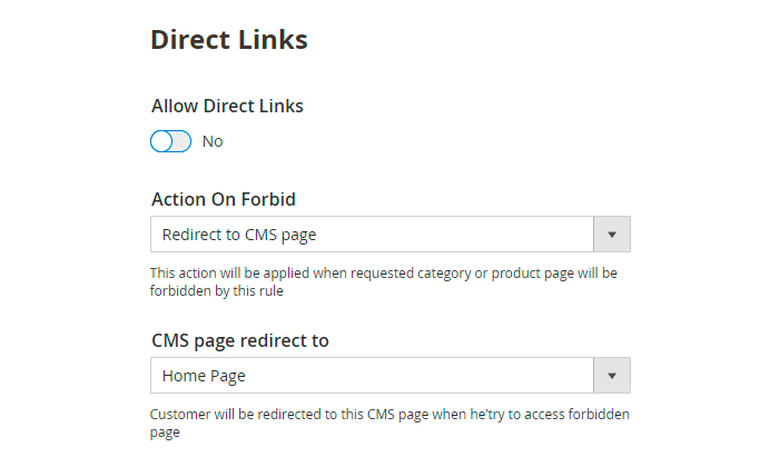 Allow Direct Links — enable this option to let customers access restricted product and category pages using direct links. Keep in mind, that this option is configured independently, e.g. even though the “Hide Product” option is set to No, you can fording direct links and vice versa, Thus, if you want to make a product available, set the “Allow Direct Links” regardless of the settings above.