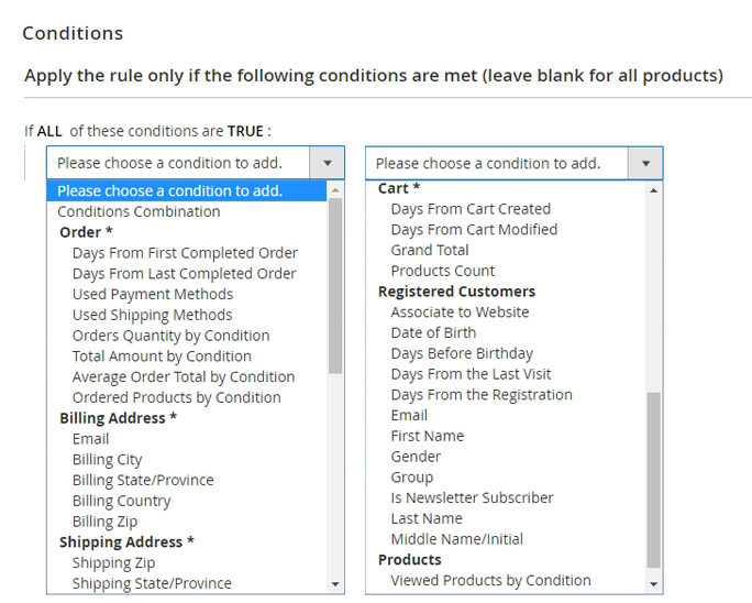 The module offers a great variety of rule conditions based on: