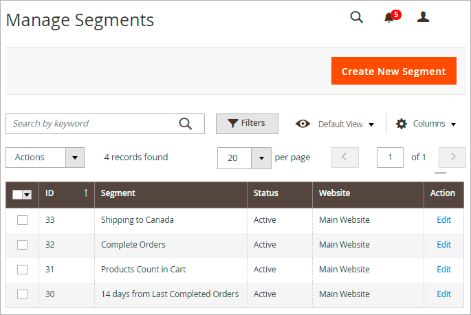 To add a new customer segment click on the Create New Segment button. All created segments are displayed on the grid. Hit the Edit link in the right grid column to modify segment info.