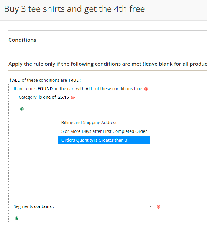 In our case, we made the rule available only for those customers who have more than 3 orders. Keep in mind, that only previously created segments will be able for creating rule conditions.