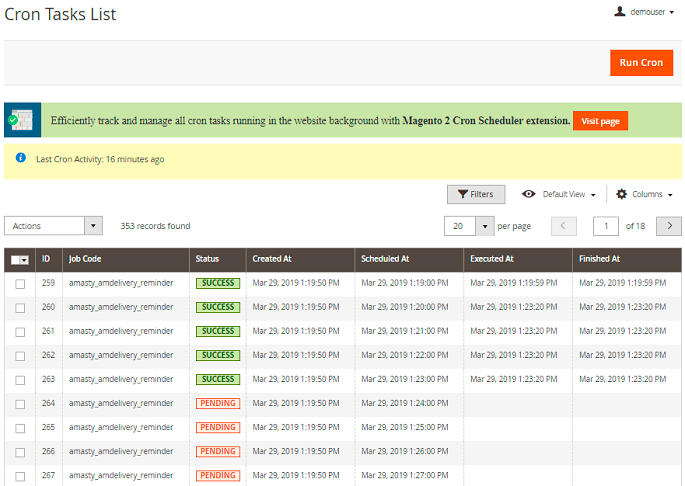 Here, you can see all the existing cron tasks and their statuses. Run cron tasks and generate their schedule by clicking the *Run Cron* button. Also, delete tasks in bulk, apply the filtering and sorting options when it is needed.