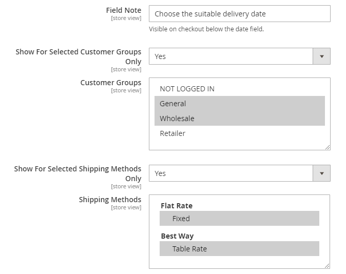 Open 'Configuration Applicability Scope' expand and select a combination of store views, shipping methods, and customer groups. The delivery schedule you'll configure here will be available for this combination only.
