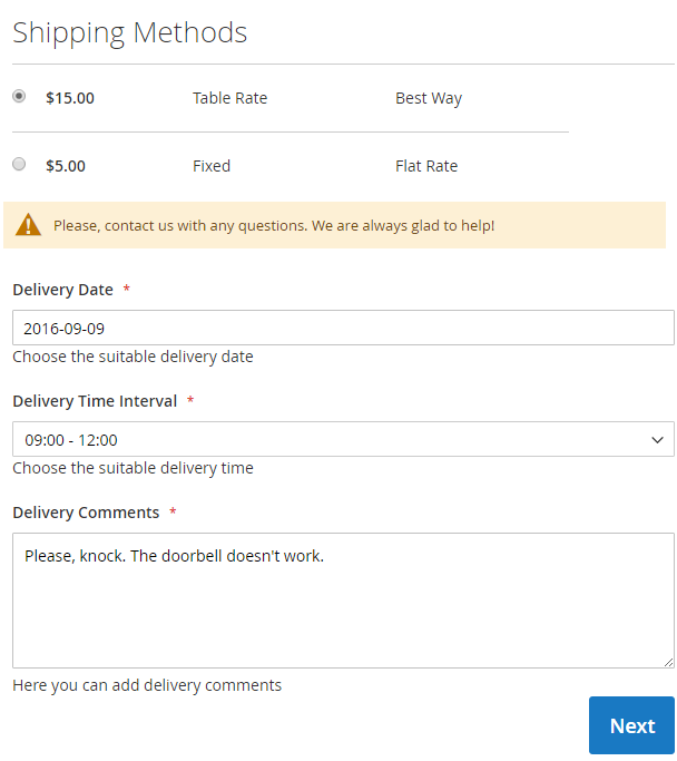 Increase the level of customer service in your store. Enable clients to choose delivery dates and time periods to receive orders. Define your delivery schedule and exclude specific days or hours when delivery is unavailable. Add delivery info to emails and printed order-related docs.