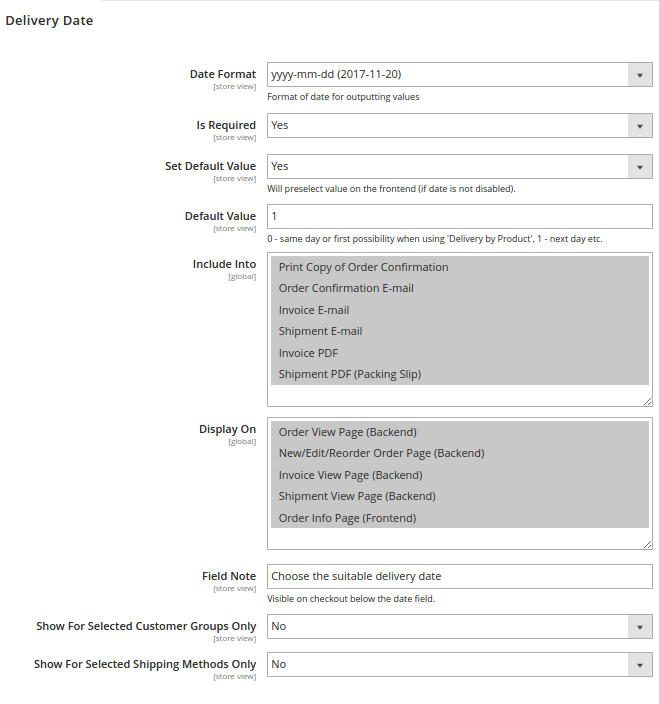 In this section, you can select the date format, choose to which documents, notifications, and backend store pages delivery date info should be included. The module allows offering the choice of delivery dates only for certain groups of customers or with particular shipping methods. Rescheduling the delivery date if certain conditions are met is supported too!