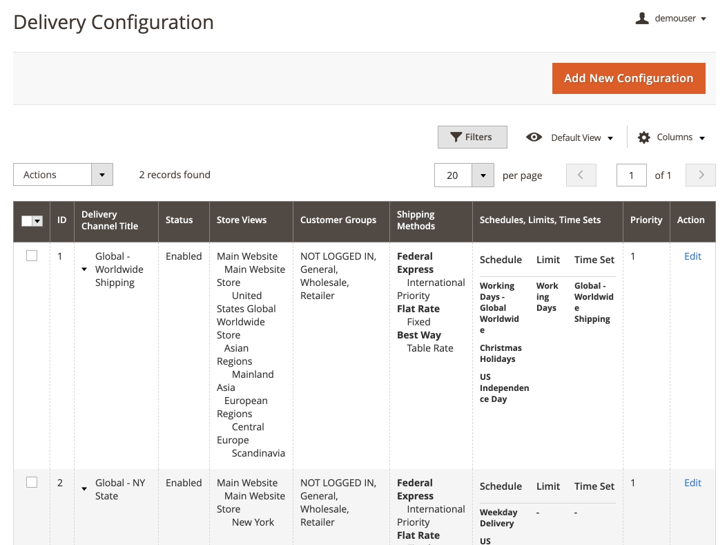 Each delivery Configuration at Sales → Delivery Configurations Grid is a separate composite entity which consists of its own delivery Schedules, Time Interval lists, and limitations.