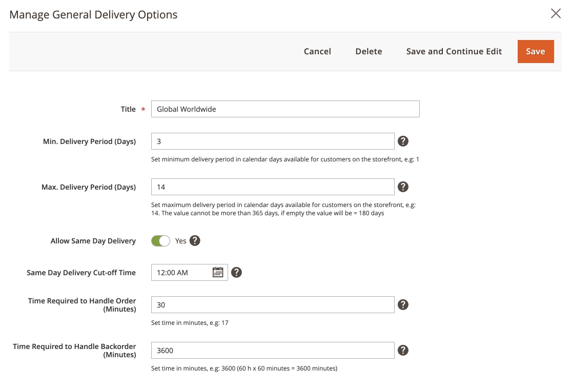 You can define the general date & time availability options in this General Delivery Options slide-in. One preset per delivery configuration.