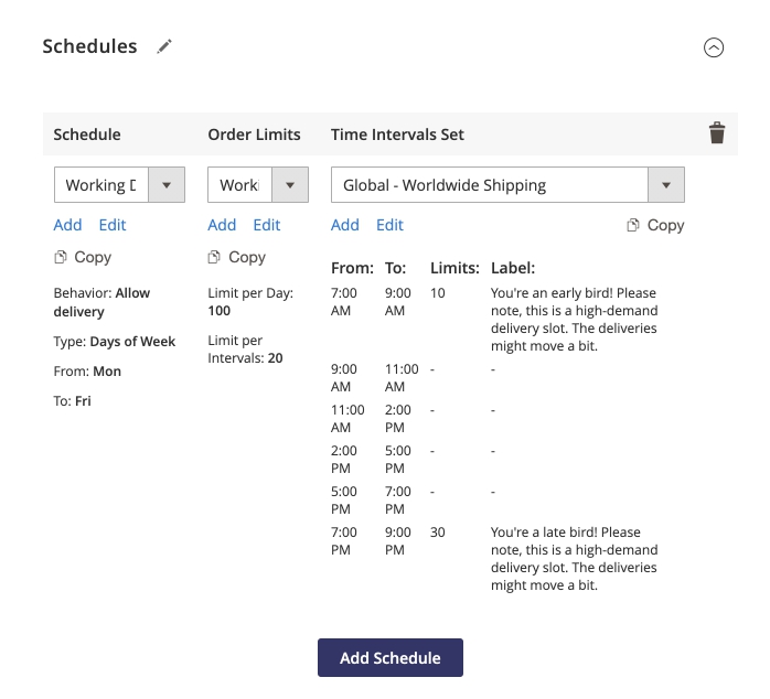 Here and below, empty value (and 0) means “Unlimited”. Multiple presets per delivery configuration are allowed, 'Edit'ing it in one configuration alters it for all configurations. Will be applied to the Working Days schedule from the same configuration section.