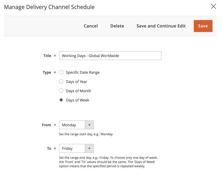 Selecting Type of Days - 'Day of Week', From - 'Monday' and To - 'Friday' will establish a generic working days schedule. 'Save' the schedule once you finished configuring days availability.