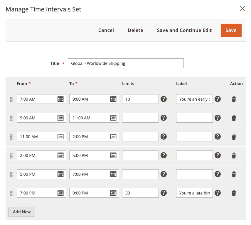 The section below contains a grid of existing time intervals, complete with in-line edit, an option to delete each and with: