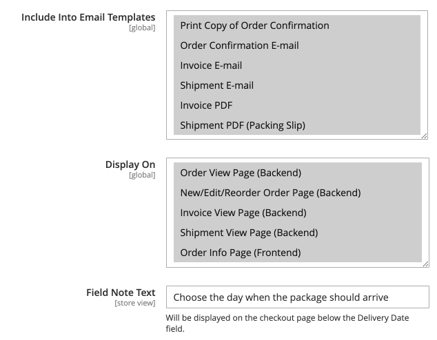 Field Note Text - enter the tooltip text that will be displayed on the checkout page below the Delivery Date field.