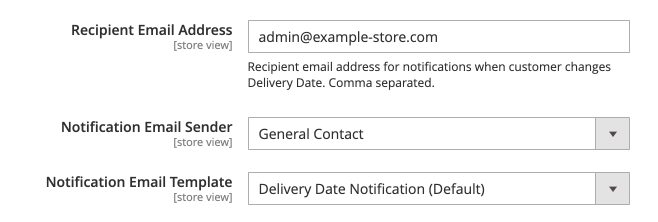 Here, you can adjust email notifications that are sent for the Delivery Date Manager extension. Set the Recipient Email Address, choose Notification Email Sender and Notification Email Template.