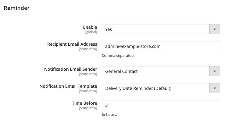 With the reminder option, you can inform customers about the upcoming delivery. Specify a particular time (in hours) before the delivery to send the reminder.