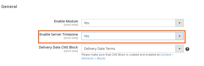 Enable Server Timezone - set to Yes if you would like to use Magento store timezone to calculate the delivery dates and time. When the Server Timezone is disabled, the extension will rely on the timezone of a customer’s device to list available the delivery dates.