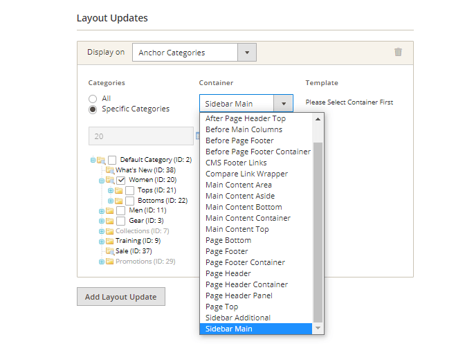 First, please choose if you want to embed your widget on Categories (anchor or non-anchor), Products (depending on the product type), or Generic Pages. Depending on that choice you'll see the available containers for that type of a store page.
