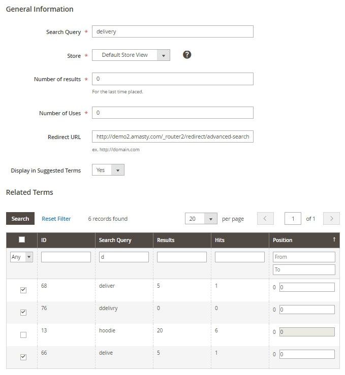 In the Related Terms table you'll get a list of all search terms that are enabled for display in suggested terms. Mark the necessary ones that match your goal by ticking the checkmark. This way, it will be much easier for a customer to navigate your store even if they've misspelled the search requests. Also, it's a great opportunity for a store owner to promote relevant searches that might be interesting for a customer and therefore motivate them to purchase in your store.