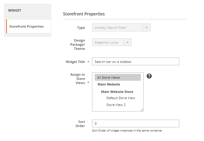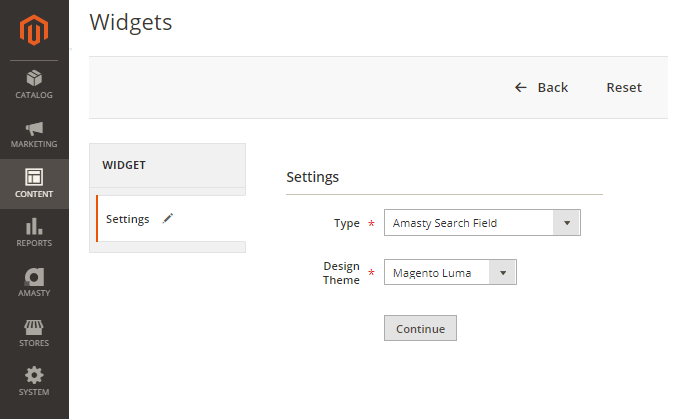 For using the first way, please navigate to Content → Widgets and click on the 'Add Widget' button. Choose the relevant theme to be applied for this widget and the widget type 'Amasty Search Field'.