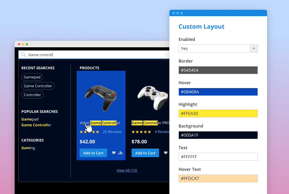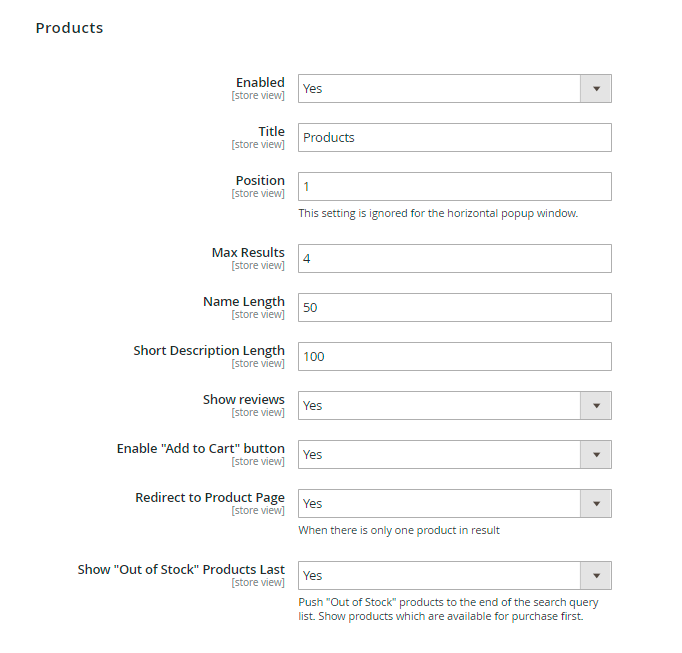 Enabled - set to 'Yes' to enable search in products and display search results in the autocomplete popup.