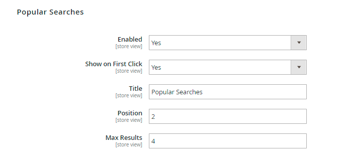 Show on First Click - set the option to Yes to let customers see the Popular Searches block in the autocomplete popup once they click on the quick search field.