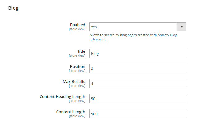 Enabled - set to Yes to enable search by blog pages and to display a blog section in the search window popup to help store visitors find the required content throughout your corporate blog.
