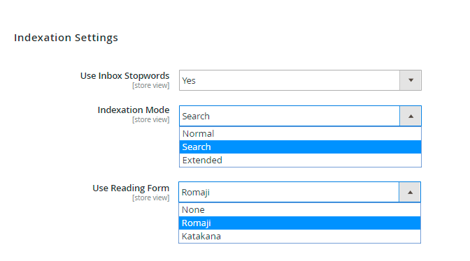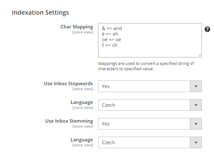Use Inbox Stemming - set to Yes and select the language to use stemmed words in search. This feature allows customers to search by the root form of the word. For example, if a customer types “bags”, he will get results with a “bag” single form as well.