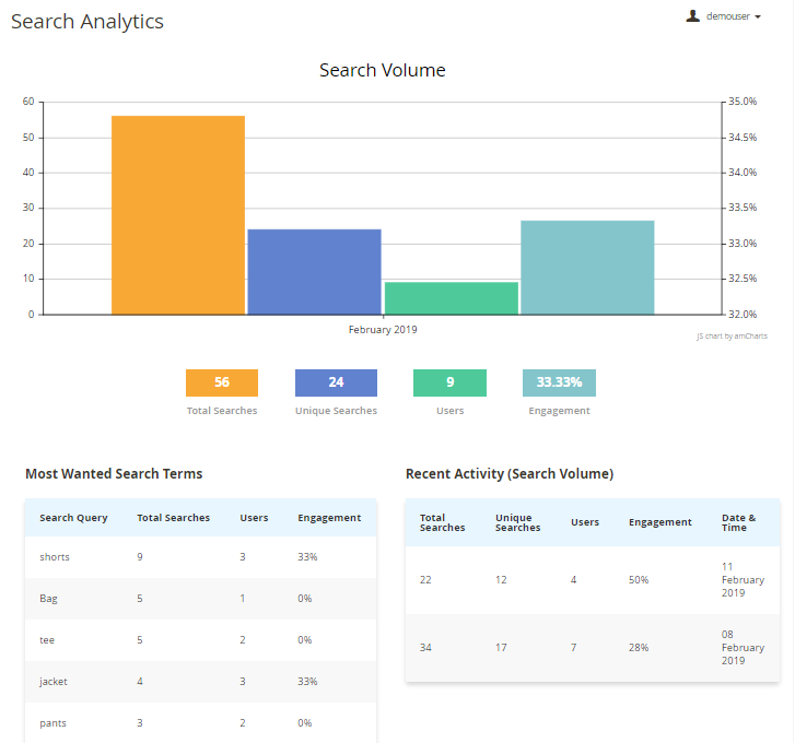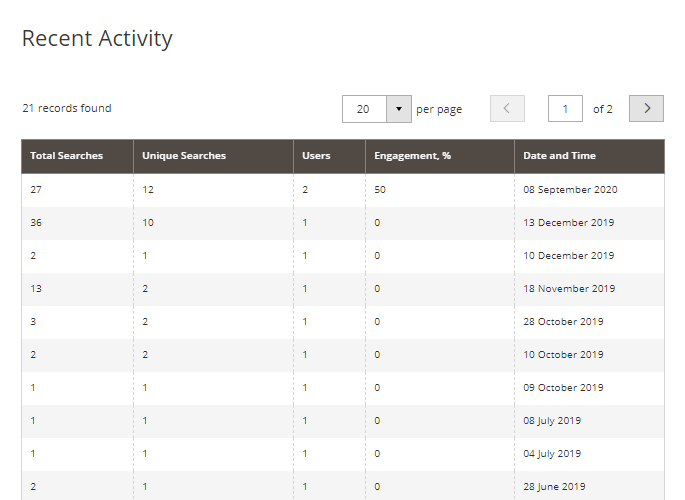 Here you can see the next values: total searches, unique searches, the number of users and users’ engagement. The Engagement statistics includes the page jumps to Brands, Categories, Blog, CMS & Landing pages.