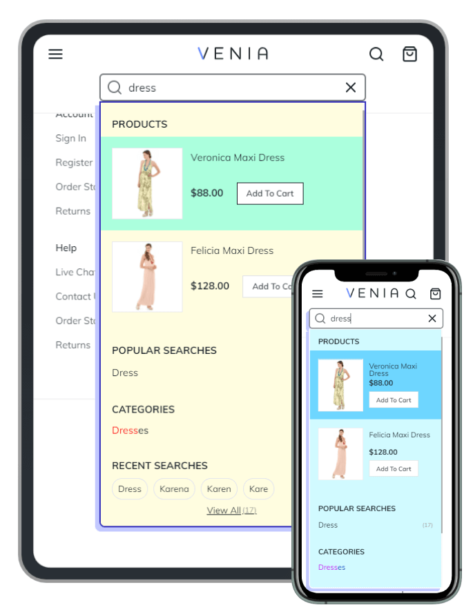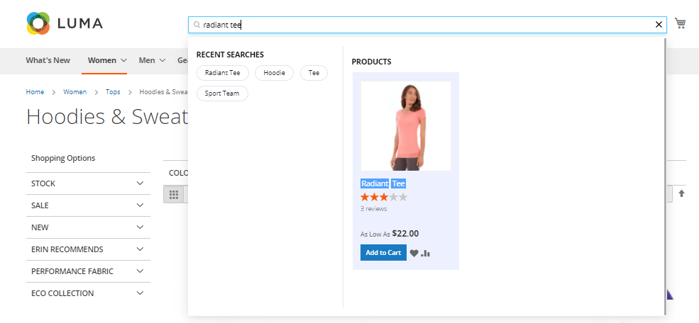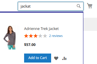 If the add-on is installed, the autocomplete popup of the Elastic Search extension will look on Venia the following way: