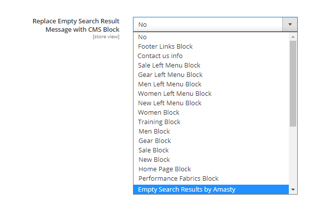 Replace Empty Search Result Message with CMS Block - Choose 'No' from the dropdown if you want the zero search results page to remain empty. Or just pick up any CMS block from the list of your blocks to be displayed in case there are no search results matching the search term.