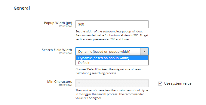Min Characters - specify the minimal number of characters that customers should type in to trigger the search process. By default, the number is three.
