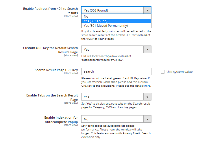 Enable Redirect from 404 to Search Results - If the option is enabled, when navigating to a broken URL or a non-existing page, a customer will be redirected to the store search results page instead of the '404 Not Found' page.