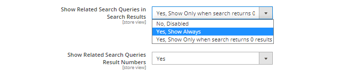 Show Related Search Queries in Search Results - this option helps customers to get relevant results anyway if it's enabled. Choose one mode of the related search results display from the three available options: