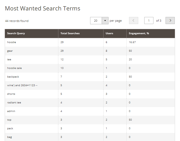 To see more details on Most Wanted Search Terms, go to Admin Panel → Reports → Most Wanted.
