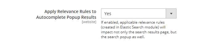 Apply Relevance Rules to Autocomplete Popup Results - Set 'Yes' to apply Relevance Rules to search autocomplete popup results.