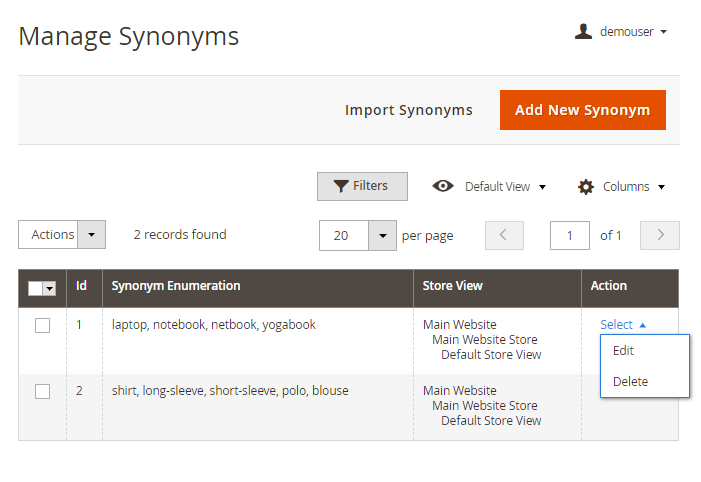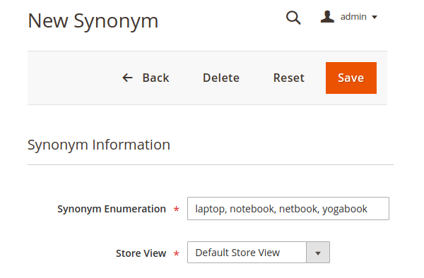 To build a dictionary of synonyms, navigate to Admin Panel → System → Manage Synonyms.