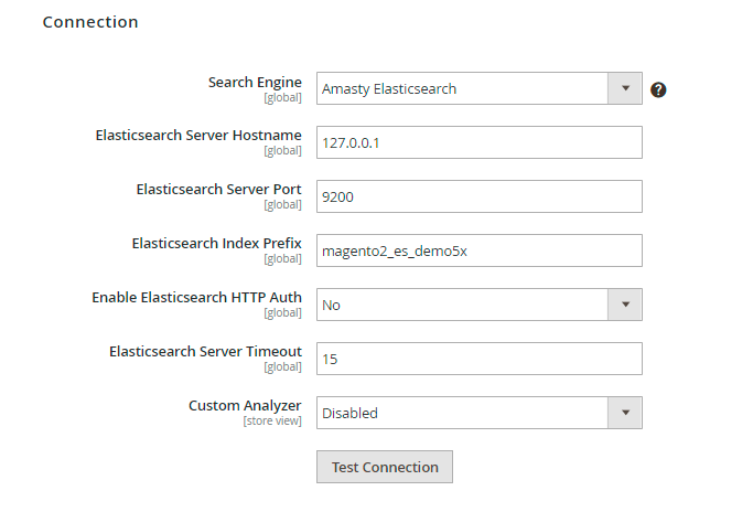 To configure Elastic Search functionality, go to Admin Panel → Stores → Configuration → Elastic Search → Catalog