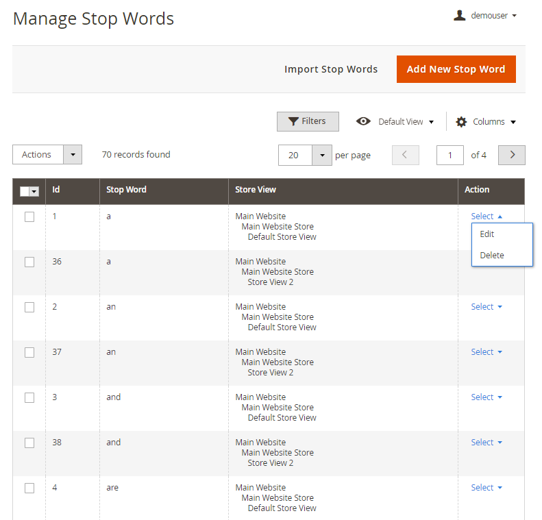 On the grid, the list of all stop words is displayed. Easily Edit or Delete each stop word via Action column.