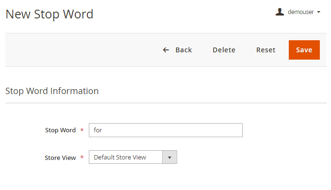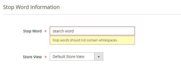Click Add New Stop Word. Specify a Stop Word and Store View for the word to be applied.