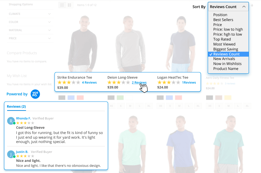 As well as with the Magento default reviews, you can use a 'Reviews Count' feature with popular Yotpo Reviews extension. Easily collect customer reviews and then display them on site pages to help buyers with purchase decisions. Moreover, analyzing customers' feedback data you can continually optimize your web store to provide better customer experience and increase your store conversion.
