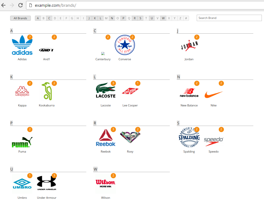 This is a frontend example of a page with an alphabetical list of all brands. Each name leads to the appropriate brand page.
