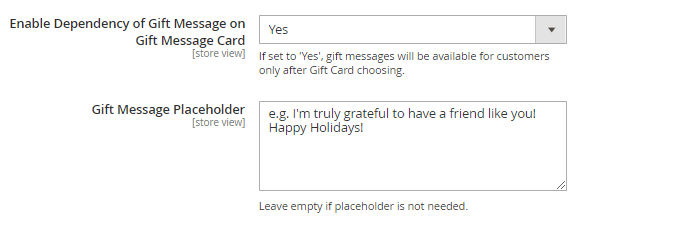 Enable Dependency of Gift Message on Gift Message Card - set this option to 'Yes' to allow customers to add gift messages if the Gift Card is chosen.
