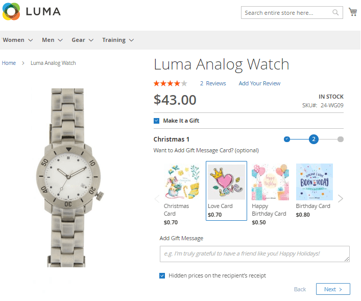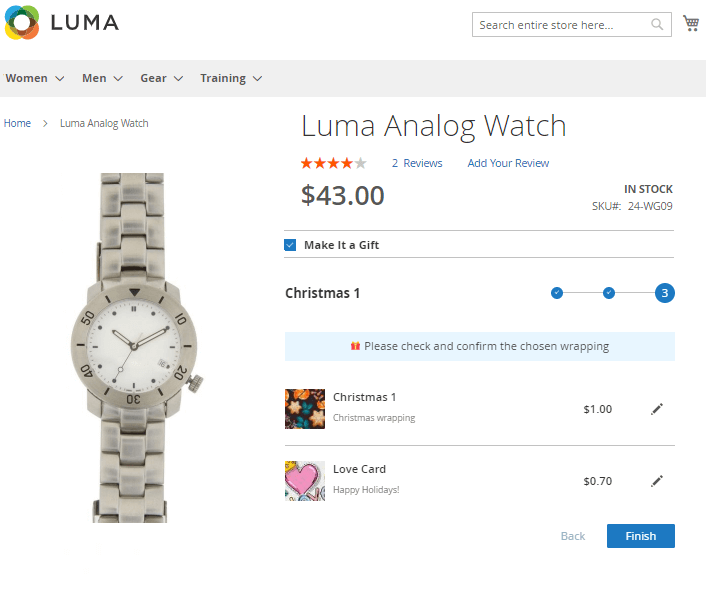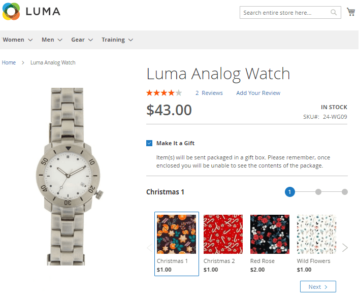 Allow customers to choose a gift wrap right on the Product Page. Offer a wide choice of designs for gift wrapping. A handy wrap slider with prices lets shoppers create unique and appealing gifts right in your webstore.