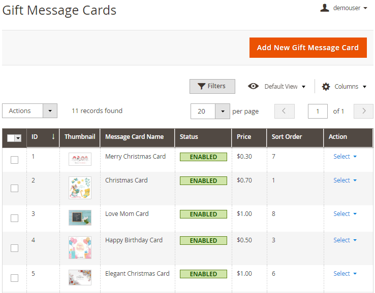 Manage all gift message cards in a separate grid. Choose any to delete or edit. Please, go to Catalog → Gift Gift Message Cards.