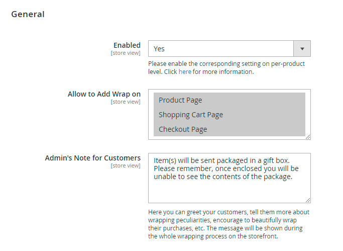 Admin's Note for Customers - here you can greet your customers, tell them more about wrapping peculiarities, encourage to beautifully wrap their purchases, etc. The message will be shown during the whole wrapping process on the storefront.