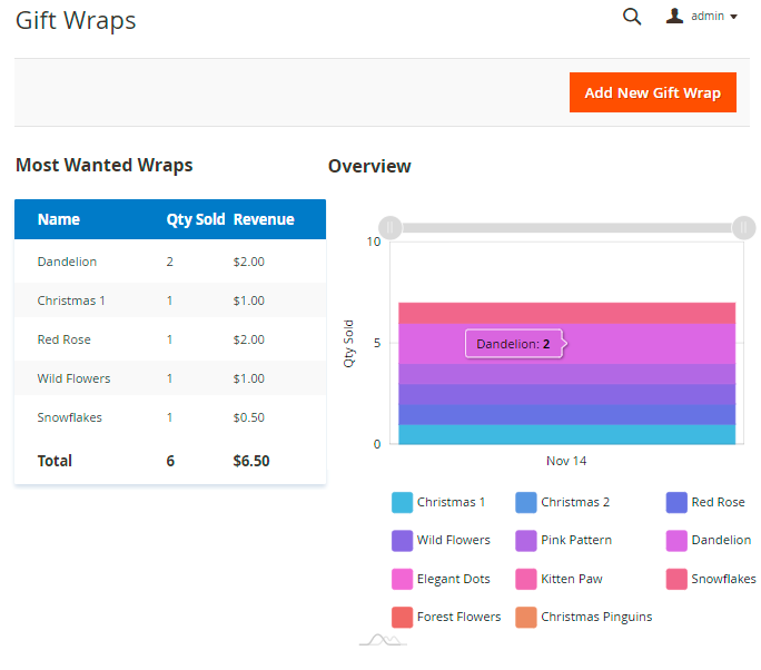 When all the wraps were created and applied to store, you can check the selling dynamics in the analytic dashboard above gift wraps gird. See the overview and check which wraps are the most popular in your store.