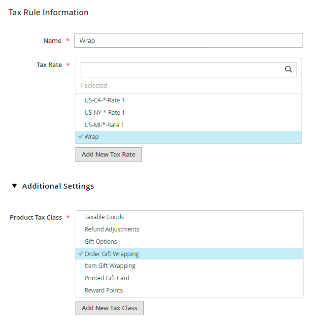 Create a new tax rule, select the necessary tax class and adjust tax settings.