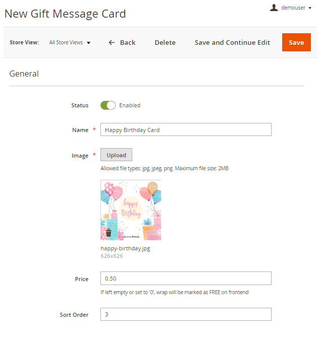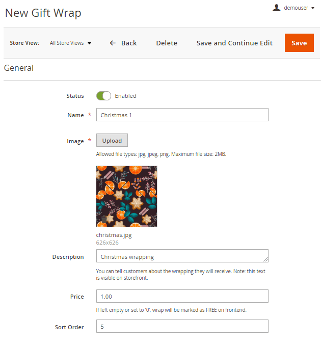 Price - specify the price of the wrapping. If you leave the field empty or set to '0’, the wrap will be marked as FREE on the frontend.
