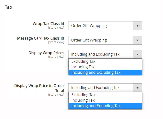 With the extension, it is possible to set taxes for gift wraps and message cards.