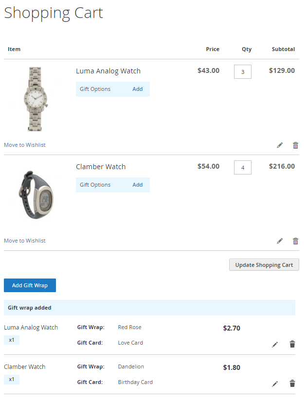Buyers can choose and edit gift wrap options on the Shopping Cart page.