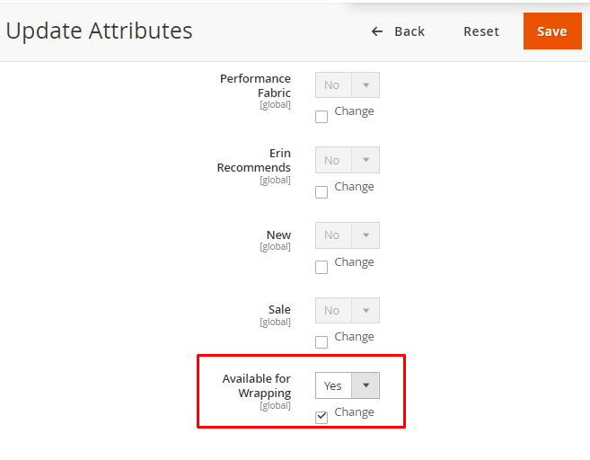 Scroll to 'Available for Wrapping' attribute in just opened Update Attruibutes window. Set to 'Yes' and click 'Save'.